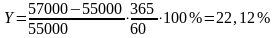 Рассчитайте доходность процентного векселя, если известно, что цена приобретения векселя составляет 55000 руб., цена погашения векселя 57000 руб., до погашения векселя осталось 60 дней.