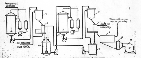 Промышленное производство адипиновой кислоты методом доокисления азотной кислотой продуктов воздушного окисления циклогексана включает следующие стадии: