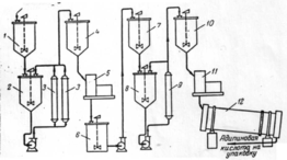 Рис.4. Периодическая схема выделения адипиновой кислоты: 1-приемный сборник; 2,8- кристаллизаторы; 3,9- холодильники; 4,7,10 – буферные сборники; 5,11 –центрифуги; 6- сборник-растворитель; 12- сушильный барабан.