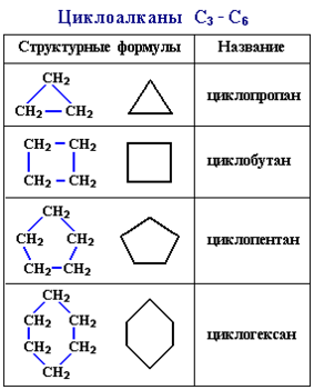 Структурные формулы циклоалканов обычно изображаются сокращенно в виде правильных многоугольников с числом углов, соответствующих числу атомов углерода в цикле5.