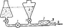 Рис. 1.4. Схема устройства для создания градиента низкого давления с двумя сообщающимися сосудами и кранами: 1 — кран; 2 — камера смешения; 3 — магнитная мешалка; 4 — к насосу; А и Б — слабый и сильный растворители
