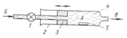 Рис. 1.5. Схема устройства для создания градиента низкого давления с использованием шприца: 1 — кран; 2 — шприц; 3 — поршень шприца; 4 — камера смешения; 5 — магнитная мешалка; 6 — к насосу; А и Б — слабый и сильный растворители