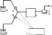 Схема формирования градиента при низком давлении представлена на рис. 1.7. Управление градиентом также возложено на программатор, однако управляет он не насосом, а двумя электромагнитными клапанами, открывая или закрывая тот или другой по заданной программе. Этим обеспечивается поступление на вход насоса 4 смеси растворителей А и Б в заданном соотношении. Смесь перемешивается в клапанной системе, подводящих линиях, поршневых камерах и окончательно становится однородной в смесителе.
