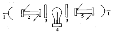 Рис. 1.11. Принципиальная схема УФ-фотометра с фильтрами: 1 — фотоприемник; 2 — рабочая микрокювета; 3 — фильтр; 4 — ртутная лампа; 5 — микрокювета сравнения