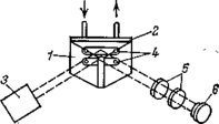 Рис. 1.13. Схема рефрактометра Френеля: 1 — призма; 2 — зеркальная стальная пластина; 3 — проектор; 4 — кюветы; 5 — фокусирующие линзы; 6 — сдвоенное фотосопротивление