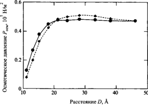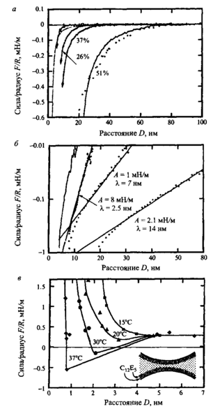 Было обнаружено очень сильное, короткодействующее взаимодействие между липидными бислоями. Расстояния, на которых проявляется это взаимодействие, лежат в диапазоне 10-30 А. Отталкивание экспоненциально уменьшается с увеличением расстояния между липидным монослоями. Для измерения соответствующей силы была использована методика, основанная на измерении осмотического давления. Аналогичным образом методом измерения поверхностных сил с помощью специального прибора были измерены силы отталкивания между поверхностями слюды. Гидратные силы отталкивания, по-видимому, действуют как между нейтральными, так и между заряженными поверхностями. Несмотря на то что поверхности слюды жесткие, а би-слойные структуры - гибкие, оба исследования дали удивительно хорошо согласующиеся результаты. Отталкивание между поверхностями слюды наблюдалось и в других жидких средах.
