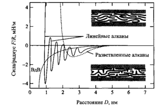 На расстояниях между двумя поверхностями, сравнимых с размерами молекул, на взаимодействие частиц начинают влиять эффекты упаковки. При определенных условиях это приводит к осцилляции профиля плотности и к появлению осциллирующей силы, зависящей от расстояния между поверхностями. Осцилляции могут накладываться на зависимости, отражающие как притяжение, так и отталкивание. Профили плотности для таких модельных систем детально исследованы с помощью компьютерного моделирования. В то же время рассчитать суммарное взаимодействие оказалось намного труднее. Иногда высказывается мнение, что осциллирующий профиль плотности автоматически приводит к осциллирующему профилю силы. Возможно, что это положение справедливо, однако до сих пор оно не доказано. Была осуществлена попытка измерить осцилляторные силы между скрещенными цилиндрами слюды в среде октаметилциклотетрасилана. Оказалось, что период осцилляции вполне соответствует молекулярным размерам. Эти силы слабо зависят от температуры, но небольшие добавки других растворителей или примесей полностью изменяют поведение системы и разрушает картину осцилляции.