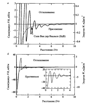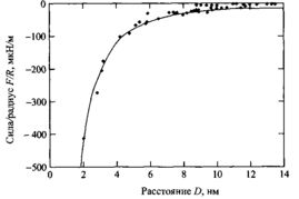 Зависимость силы притяжения Ван дер Ваальса между двумя поверхностями слюды в воздухе от расстояния между пластинами.
