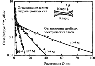 Гидратные силы отталкивания между поверхностями слюды в растворе электролита. Следует отметить, что отталкивание возникает только при концентрации соли > 1мМ.