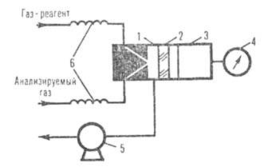 Рис.8. Хемилюминесцентный газоанализатор: 1-рсакц. камера; 2-светофильтр; 3 - фотоумножитель; 4-вторичный прибор; 5-побудитель расхода газа; 6-дроссели.