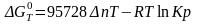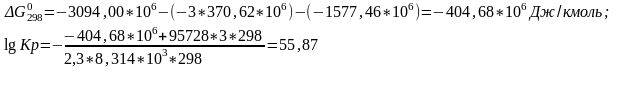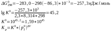 ΔG=-8,314*1000ln(2,450*1020)+8,314*1000ln(2,0266*104)= -390324-82447=-472,77 кДж/моль.