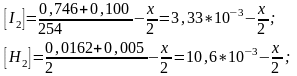 При добавлении к исх. смеси 0,100кг I2 и 0,005 кг H2 установ. равнов., но Кс не изменится. Обозначим новую равновесную конц. [HI]=x, тогда равнов. конц. [I2 ] и [H2 ] будут равны: