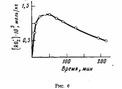Рис. 6. Характер изменения концентрации R02 » при озонировании порошка ПС ([Оз]=1,74–10-4 моль/кг, поверхность образца 6 м2/г)