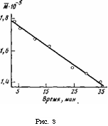 Рис. 3. Изменение молекулярной массы ПС во времени в процессе его взаимодействия с озоном (СС14, 20°)