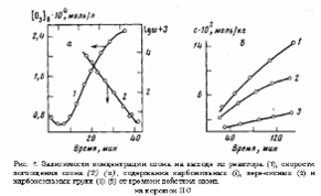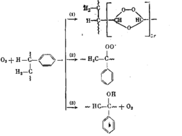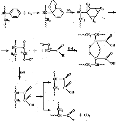 Реакция (1) приводит к образованию ароматических озонидов, которые составляют основную долю перекисных соединений. По данным ИК-спектроскопии можно оценить их долю, которая составляет 10–15% в расчете на прореагировавший ПС. Промежуточные стадии реакции ответственны за сложные зависимости изменения вязкости растворов во времени при озонировании.