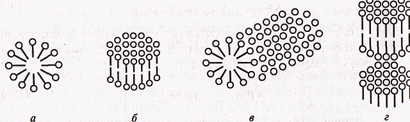 Рис.1. Формы мицелл: а — сферические; 6 — дискообразные; в — цилиндрические; г — пластинчатые