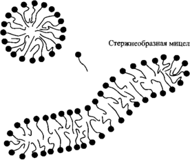 Третий, встречающийся реже тип поведения - это рост очень длинных червеобразных мицелл, происходящий уже при очень низких концентрациях, иногда лишь немного превышающих ККМ. Рост мицелл обычно происходит в одном измерении с образованием агрегатов с круговым поперечным сечением. Гидрофобное ядро имеет радиус, совпадающий с радиусом сферических мицелл и, следовательно, равный длине вытянутой алкильной цепи молекулы ПАВ. Линейная длина стержнеобразных мицелл может варьироваться в широких пределах, примерно от 10 нм до многих сотен нанометров.