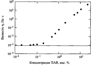 В случае ПАВ, способных к образованию больших мицелл, вязкость быстро увеличивается с ростом концентрации. Зависимость вязкости нулевого сдвига от концентрации.