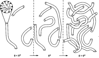 Существует глубокая аналогия между дисперсиями длинных мицелл и растворами полимеров, в том числе образование сеток зацепления. На рисунке показан переход от разбавленных систем к полуразбавленным; ф* - объемная доля перекрывания.
