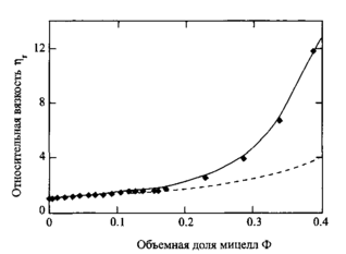 В разбавленных растворах, когда мицеллы не перекрываются, они ведут себя как независимые единицы. При превышении объемной доли мицелл, равной ф*, т.е. в полуразбавленном концентрационном режиме, мицеллы запутываются и возникают сетки зацепления. Такие сетки можно описать с помощью корреляционной длины, которая не зависит от размера мицелл и их полидисперсности. В системе, показанной на рис., объемная доля перекрывания равна - 0.1%. Вязкость дисперсий длинных линейных мицелл можно анализировать в рамках представлений о мицеллярном движении, используя, например, модель так называемой рептации для полимерных систем. Подразумевается, что мицеллы "ползут" через трубки в пористой структуре, образованной другими мицеллами. Вязкость нулевого сдвига з зависит от размера мицеллы и объемной доли ц: