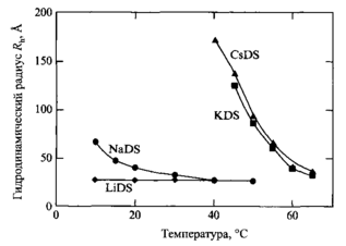 Размер мицелл додецилсульфатов щелочных металлов уменьшается с увеличением температуры и чрезвычайно чувствителен к природе противоиона. Состав систем: LiDS,20 г/л + IM LiCl; NaDS,20 г/л + 0.45 M NaCl; KDS, 5 г/л + 0.45 M KCl; CsDS, 5 г/л + 0.45 M CsCl. Видно, что в системах с KDS и CsDS, несмотря на более низкую концентрацию этих ПАВ, размеры увеличиваются сильнее, чем в системах, содержащих LiDS или NaDS.