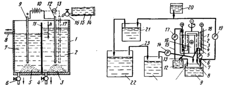 На приведенной схеме показан предпочтительный вариант, при котором обрабатываемый раствор подается в катодное отделение. Можно также подавать раствор в анодное отделение и выводить обработанный раствор из катодного отделения (с соответствующей заменой трубопроводов для подачи и слива раствора). Необходимо также иметь в виду, что между центральным отделением и наружными отделениями существует гидравлический напор А.