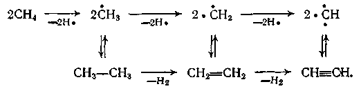 Подобно пиролизу на олефины, реакции образования ацетилена имеют радикально-цепной механизм, причем цепь превращений метана и этана можно представить примерно так: