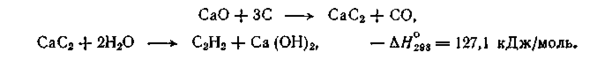 Карбид кальция получают из оксида кальция и кокса в электродуговых печах. Реакция сильно эндотермична и требует больших затрат электроэнергии, что составляет существенный элемент в себестоимости производимого ацетилена.