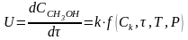 Образующиеся при синтезе побочные продукты оказывают существенное влияние на стадию хемосорбции и на кинетику образования метанола в целом. Поэтому, для реакции синтеза метанола предложено большое количество различных кинетических уравнений, выведенных на основе выдвинутых их авторами предположений о механизме реакции. Независимо от этого, время контактирования для реальных условий процесса синтеза может быть рассчитано по формуле [2]:
