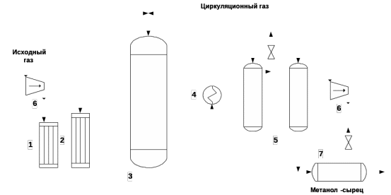 1 – масляный фильтр; 2 – угольный фильтр; 3 – колонна синтеза; 4 – холодильник-конденсатор; 5 – сепараторы; 6 – компрессоры;