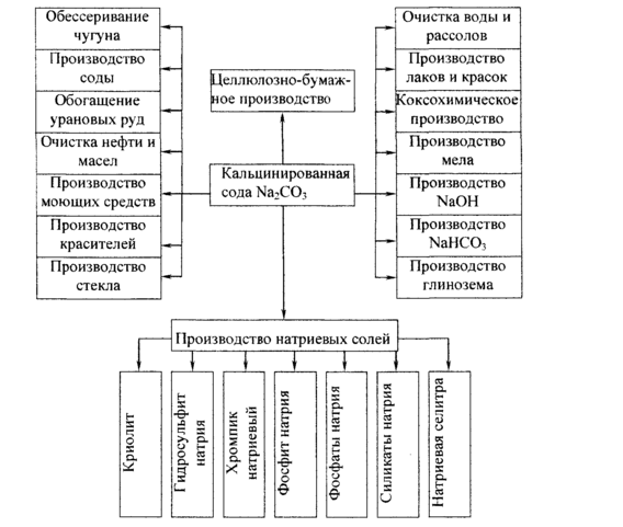 В химической промышленности сода применяется для получения NaOH химическими методами, NaHCO3, соединений хрома, сульфитов и фторидов, фосфатов, NaNO2 и NaNO3, для очистки рассолов, а также используется для производства различных видов стекол.