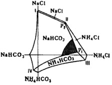 I–Р2 – растворы, насыщенные NaHCO3 и NaCl; P2–P1 – растворы, насыщенные NaHCO3 и NaCl; P1–IV – растворы, насыщенные NaHCO3 и NH4HCO3;