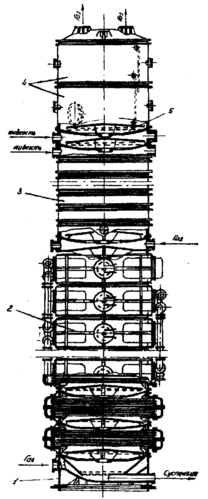 Такая карбонизационная колонна представляет собой цилиндрическую пустотелую емкость, в которой размещены абсорбционные и холодильные элементы. Абсорбционная (верхняя) зона колонны имеет 17 царг с перекрестно-точными контактными элементами. Холодильная зона имеет 8 холодильных царг, оснащенными трубками в которые вводится вода. Все царги, тарелки и другие узлы и детали карбонизационной колонны выполнены из серого чугуна марки СЧ 18-36. В абсорбционной части колонны устанавливают перекрестно-точные дырчатые контактные элементы с двойным переливом. Холодильная часть карбонизационной колонны может быть выполнена в двух вариантах. В типовом исполнении, между холодильными царгами устанавливаются пассетные противоточные тарелки.