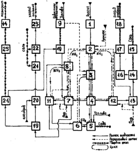 Известковую суспензию, подаваемую на дистилляцию, получают гашением извести (X), поступающей из обжигательных печей (IX). Диоксид углерода, образующийся при обжиге карбонатного сырья подают на карбонизацию.