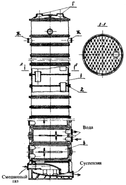 Карбонизационная колонна представляет собой цилиндрическую пустотелую ёмкость диаметром до 3 м и высотой до 28 м, состоящую из ряда царг (бочек). Сверху в колонну поступает раствор из первого промывателя газа колонн, а в царгу–базу 1 и абсорбционную царгу 3, расположенную над холодильной зоной, подаётся газ. При работе колонна заполнена раствором до определенного постоянного уровня. Поэтому объем поступающего в колонну раствора соответствует объему отбираемой из колонны суспензии.