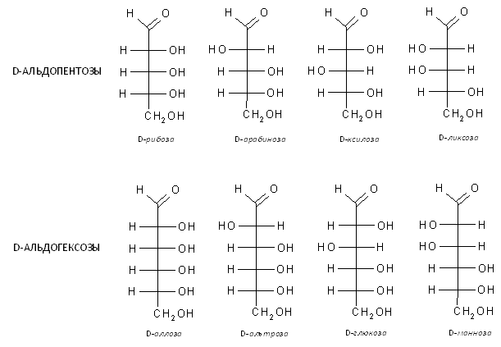 В качестве обозначения противоположных конфигураций редуцирующих сахаров с одинаковыми названиями применяются буквы D и L, которые указывают принадлежность к двум рядам. Последний асимметрический атом углерода определяет принадлежность к стереохимическому ряду. Гидроксильная группа справа – D – ряд; слева – L – ряд. В природе одни моносахариды встречаются больше в Д-конфигурации, чем в L, другие наоборот (L-арабиноза часто встречается в растениях, тогда как D-арабиноза обнаружена только в некоторых видах бактерий).
