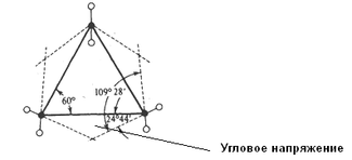 Такое отклонение создает в молекуле напряжение, которое, в свою очередь, понижает ее устойчивость. Расчет дал отклонение валентного угла от нормального для четырехчленного цикла +9°44', пятичленного 0°44', шестичленного -5° 16'.