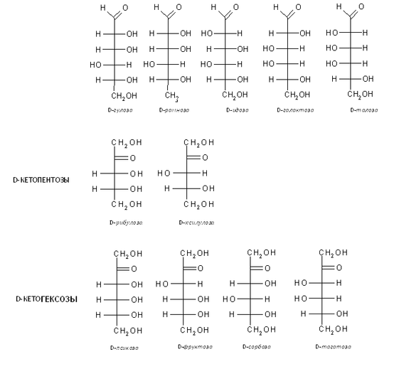 В природе моносахариды (монозы) распространены и имеют наибольшее значение пентозы общей формулы С5Н10О5 и гексозы общей формулы С6Н12О6, не могут гидролизоваться и превращаться в более простые углеводы. По химическому строению моносахариды представляют собой многоатомные спирты, имеющие альдегидную группу (альдегидоспирты, оксиальдегиды, альдозы — когда на конце углеродной цепи присутствует карбонильная группа) или кетонную группу (кетоспирты, оксикетоны, кетозы — когда карбонильная группа расположена в ином другом положении). Отсюда, глюкоза и фруктоза являются функциональными изомерами. Функциональные изомеры различаются и расположением гидроксильных групп, как это видно из сравнения структур глюкозы и галактозы. Такие пространственные изомеры называются диастереомерами. Они различаются физическими и химическими свойствами.