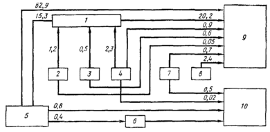 Схема потребления первичных н вторичных железосодержащих материалов при производстве железа и стали в США в 1976 г. (в миллионах американских тонн железа, 1 т = 907,2 кг)