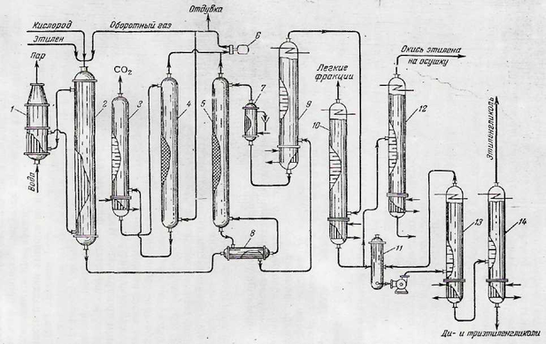 1 — котел-утилизатор; 2 — реактор; 3 — колонна для отгонки СО2; 4 — абсорбер СО2; 5 — абсорбер окиси этилена; б — компрессор; 7—холодильник; 3 — теплообменник; 9 — колонна для отгонки окиси этилена; 10 — колонна для отгонки легких компонентов; 11 — реактор для синтеза гликолей; 12 — колонии для обезвоживания окиси этилена; 13 — дегидрагатор; 14 — гликолевая колонна.