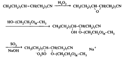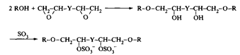 Анионные и неионные димерные ПАВ обычно получают путем раскрытия циклов бисэпоксидов, в результате этой реакции в качестве промежуточного продукта получается бисгидроксиэфир. Ниже приведена реакция синтеза димерного ПАВ, в котором полярными группами служат сульфат-группы:
