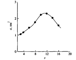 На рис. 5 показано изменение площади, приходящейся на молекулу ПАВ, в зависимости от длины мостика для ряда катионных димерных ПАВ. Из рисунка видно, что при длине мостика в 10-12 атомов углерода наблюдается максимальное значение площади а на молекулу. Такая зависимость объясняется изменением положения гидрофобного мостика. При длине менее 10 атомов углерода он располагается на поверхности почти плоско, занимая все большую и большую площадь с ростом числа метиленовых групп. Если мостик содержит более 12 атомов углерода, его цепочка начинает складываться, образуя петли, которые выталкиваются в воздух. Это объяснение аналогично тому, которое было дано выше для зависимости KKM от длины цепи гидрофобного мостика.