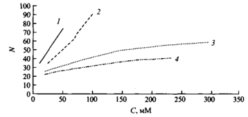 Рис. 6. Зависимость мицеллярных чисел агрегации N от концентрации С катионных димерных ПАВ, содержащих гидрофобную группу С12Н25 и мостики разной длины. Длина мостика: три метиленовые группы, четыре метиленовые группы, пять метиленовых групп. Для сравнения представлены данные для мономерного аналога.