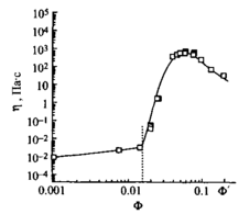 Вязкость мицеллярных растворов ПАВ зависит от формы мицелл. В случае катионного димерного ПАВ с гидрофобными радикалами С12Н25 и мостиком из двух метиленовых групп обнаруживается резкое увеличение вязкости при 2%-ной концентрации. Из рис. 7 видно, что вязкость изменяется на 6-7 порядков в очень узком концентрационном интервале. Это изменение намного больше изменений вязкости в зависимости от концентрации, характерных для обычных катионных ПАВ, и связано с резким переходом от сферических мицелл к червеобразным мицеллам. Это характерное свойство димерных ПАВ с короткими мостиками. Такой переход и увеличение вязкости можно индуцировать наложением сдвигового напряжения даже при более низких концентрациях, чем в статических условиях. Необычные реологические свойства димерных ПАВ могут найти важные практические применения.