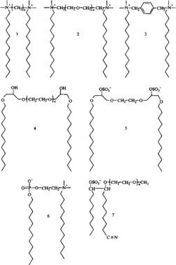 На рис. 2 представлены некоторые примеры димерных ПАВ. Соединения 1-3 — катионные ПАВ, различающиеся длиной мостика, связывающего ионные группы. В соединении 1 мостик гидрофобный и гибкий; в соединении 2 — гидрофильный и гибкий, а в соединении 3 — гидрофобный и жесткий. Соединения 4 и 5 имеют похожую структуру молекул, но соединение 4 — типичное неионное димерное ПАВ, а соединение 5 — анионное. Соединения 6 и 7 — примеры гетеродимерных ПАВ.