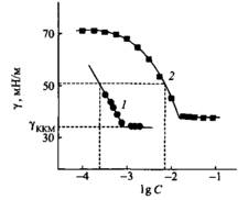 Поразительное свойством димерных ПАВ состоит в том, что мицеллобразование в их растворах начинается при концентрациях на порядок ниже, чем для соответствующих «мономерных» ПАВ. Низкое значение KKM — важнейшее свойство, означающее, что димерные ПАВ очень эффективны при солюбилизации неполярных соединений. Эффективность снижения поверхностного натяжения, выраженная величиной С20, также выше для димерных ПАВ. Поверхностное натяжение для растворов таких ПАВ в точке KKM ниже, чем для растворов «мономерных» ПАВ. На рис. 3 в качестве примера приведены изотермы поверхностного натяжения катионного димерного ПАВ и соответствующего мономерного соединения. Интересно сравнить свойства катионного димерного ПАВ, которое содержит два гидрофобных радикала и две гидрофильные группы, с обычным катионным ПАВ, содержащим два таких же гидрофобных радикала и одну полярную группу. KKM бромида ди-децилдиметиламмония равна 1.8 · IO3 М, а у более длинного гомолога бромида дидодециламмония — 1.7 · IO^ М. Как следует из рис. 3, KKM димерного ПАВ с додециловыми гидрофобными радикалами очень низкая.