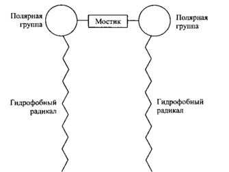 Молекулу димерного поверхностно-активного вещества можно представить как две дифильные молекулы соединенные мостиком. Структура таких ПАВ в общем виде представлена на рис. 1. Димерные ПАВ называют также ПАВ-близнецы или бис-ПАВ.