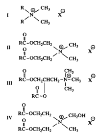 Рис. 13. Структуры обычного четвертичного аммониевого ПАВ и трех сложных эфиров ЧАС; R — длинная алкильная цепь, X — Cl, Br или CH3SO4
