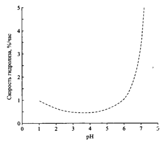 Катионный заряд вблизи сложноэфирной связи делает нормальные эфиры ЧАС необычайно стабильными в кислых и лабильными в щелочных средах. Такая сильная зависимость от рН может быть использована для инициирования быстрого разложения ПАВ. Этот эффект еще больше проявляется у эфиров бетаина. Механизм их гидролиза подробно обсуждается ниже. Зависимость от рН скорости гидролиза эфиров ЧАС показана на рис. 14. Видно, что скорость гидролиза минимальна при рН 3-4 и резко увеличивается при рН выше 5-6. Понятно также, что композиции, содержащие сложные эфиры ЧАС, должны использоваться при низких рН.