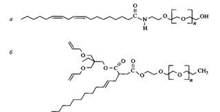 Рис. 2. Два неионных ПАВ, способных к автоокислению: а — этоксилированный моноэтанол-амид линолевой кислоты; б — этоксилированный сложный моноэфир додеценилянтарной кислоты и простого эфира триметилолпропандиаллила